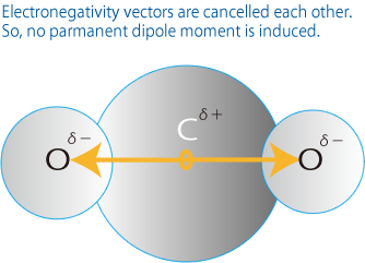 CO2, composed of heteronuclear atomes, has no parmanent dipole moment since electronegativity vectors are cancelled each other.